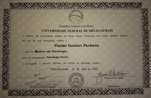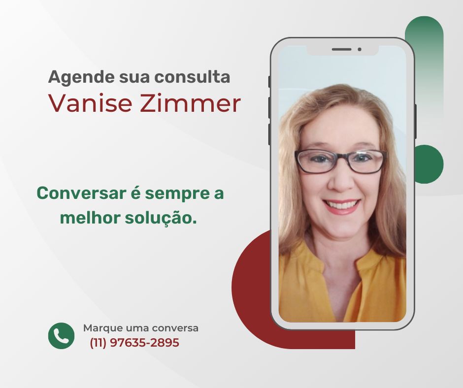 Sou a Dra. Vanise Zimmer, psicóloga clínica, CRP 06/112756, com formação na Alemanha com pós graduação em gênero e tecnologia pela Leibniz University na Alemanha. Sou Mestre em Psicologia pela UFMG e Doutora em Engenharia Cognitiva pela USP. Sou Especialista em Psiquiatria e Saúde Mental pela Faculdade de Medicina da USP. Sou Certificada internacionalmente como Mediadora Intercultural e de Família nos EUA, Alemanha e Brasil. Sou membro da Associação Internacional de Psicologia Econômica, Certificada em Psicopatologia Psicanalítica e Esquisoanálise pelo Instituto Gregório Baremblit.