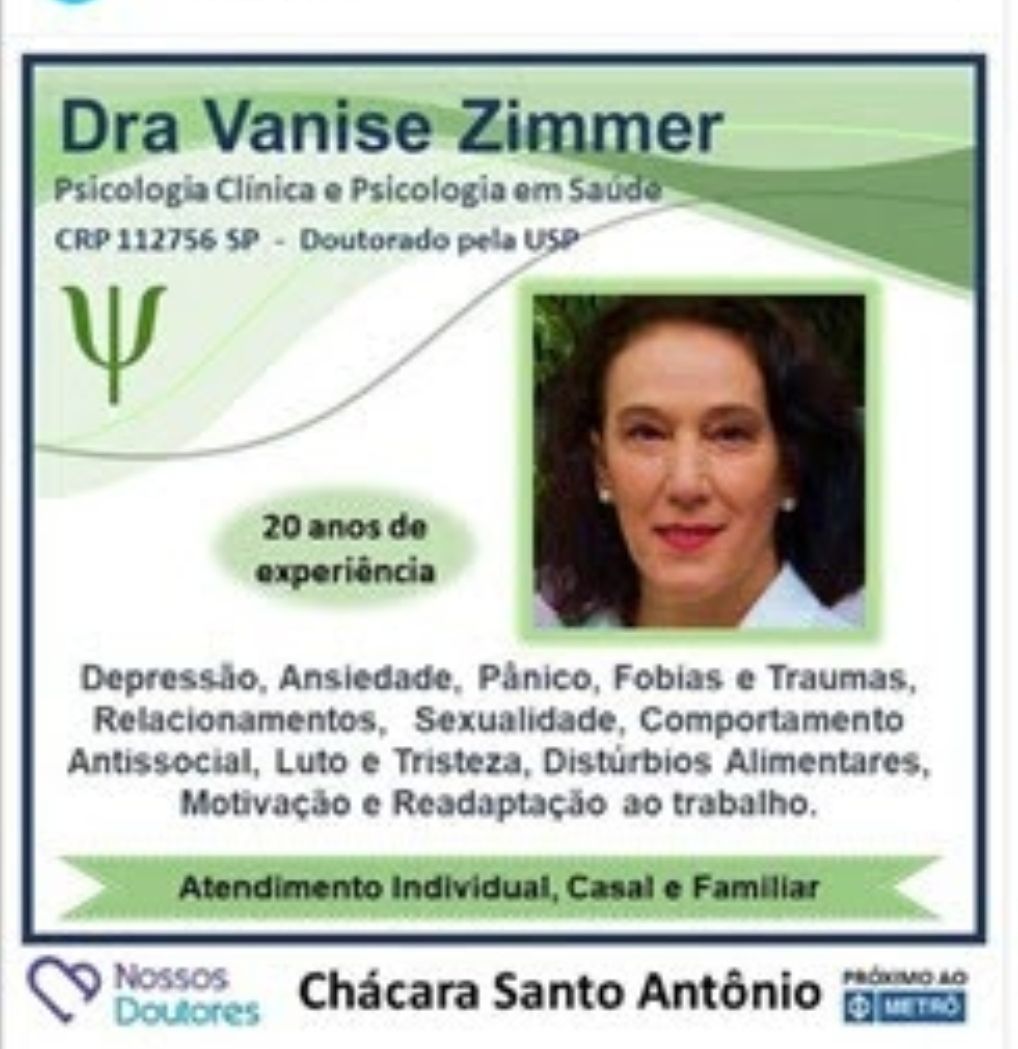 Seja bem vindo! Psicóloga Mestre e Doutora pela USP, especialista em Psiquiatria e Saúde Mental, com formação em Neuropsicologia e TCC pela USP. Psicoterapeuta Psicodinâmica e Analista do Comportamento há 25 anos com 66 recomendações Top 5 de clientes. Ofereço diagnóstico e Psicoterapia para depressão, ansiedade, Burnout, traumas e outros transtornos. Atendo adultos, adolescentes, casal e família.
